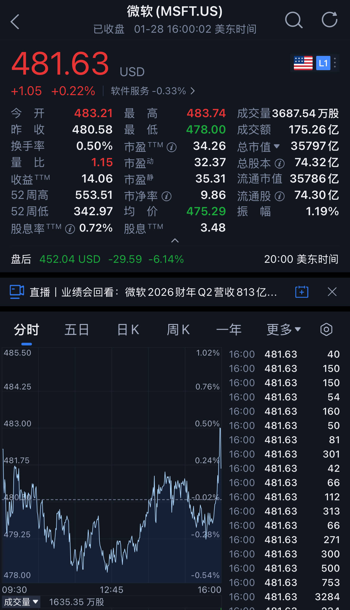 截至周三收盘,微软股价略微上涨0.22%至482美元/股,市值达3.58万亿美元(约合24.87万亿元人民币)。