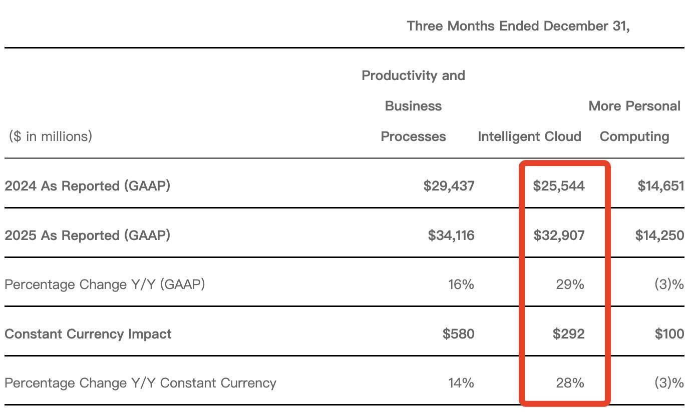 2025年全年,微软智能云业务收入达1205亿美元,相比2024年的1048亿美元同比增长15%。