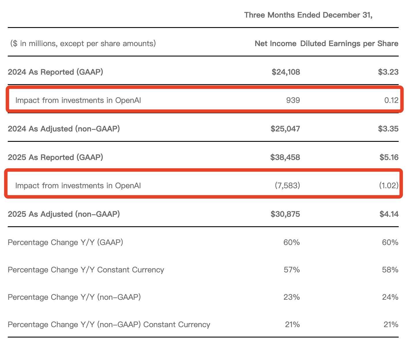这一统计口径的利润变少,主要是扣除了投资OpenAI所获得的收益。该季度由于投资OpenAI的净收益,净利润和摊薄后每股收益分别增加76亿美元和1.02美元。