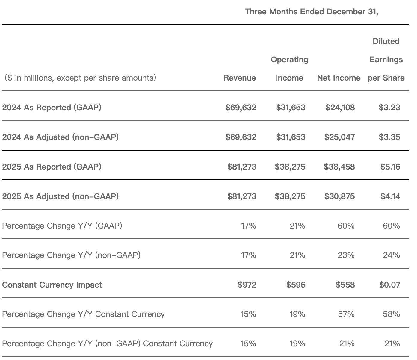 在净利润(GAAP)方面,受投资OpenAI收益等因素影响,其增长率飙升至60%,达到385亿美元。