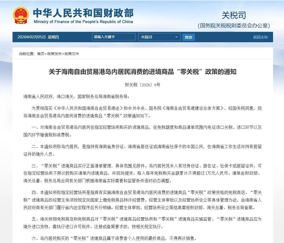 人民网海口2月5日电 (潘惠文、蒋成柳)2月5日,财政部等三部门联合发布《关于海南自由贸易港岛内居民消费的进境商品“零关税”政策的通知》(以下简称《通知》)。
