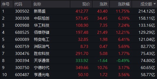 个股方面,新易盛成交额超214亿元居首,中际旭创、华工科技、佰维存储成交额靠前。