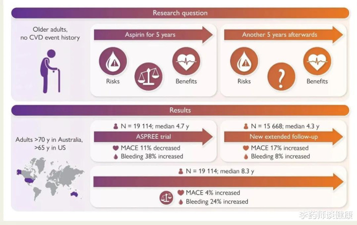 一项最新发表于心血管领域顶刊 EHJ (欧洲心脏病学杂志)上的一项重磅ASPREE研究重,通过近9年的长期随访,发现对于尚无心血管疾病的70岁以上老年人,长期服用阿司匹林,并没有降低心血管事件的发生率,反而带来了2方面的风险。今天的这篇科普,就结合这项新研究的结果,和大家聊一下老年人合理使用阿司匹林的那些事儿。