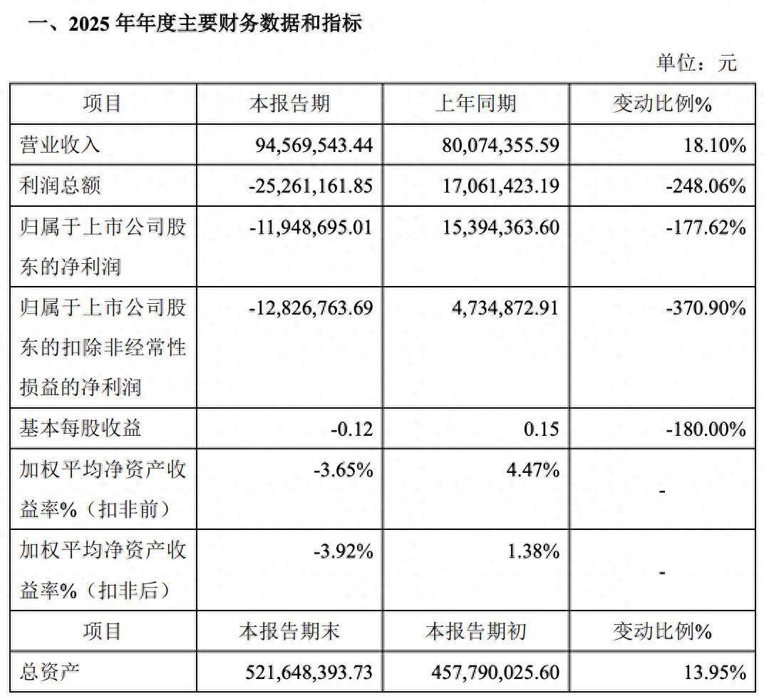 华维设计(920427)日前公布2025年业绩快报,数据显示,公司营业收入为9457万元,同比增长18.10%;归母净利润约亏损1195万元,同比下降177.62%;扣非净利润为-1283万元,同比下降370.90%。
