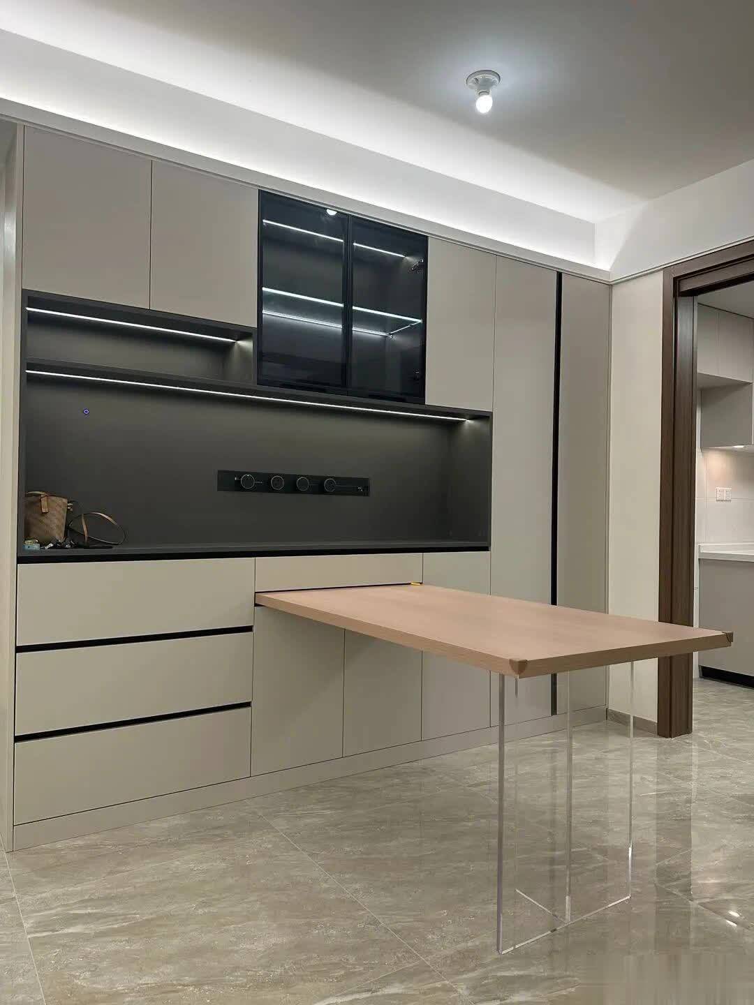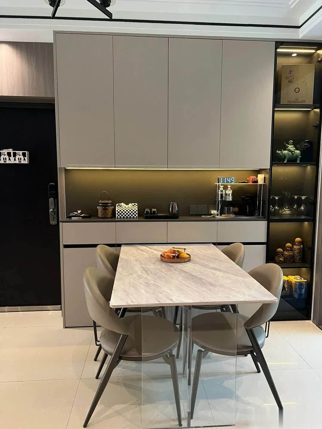 - 设计亮点:酒柜采用“封闭 + 开放”相结合的方式,下层封闭柜用于放置餐具、杂物,中层开放格用来摆放酒杯、酒水,上层吊柜放置轻量物品,餐桌与酒柜无缝衔接,视觉上更加整体。