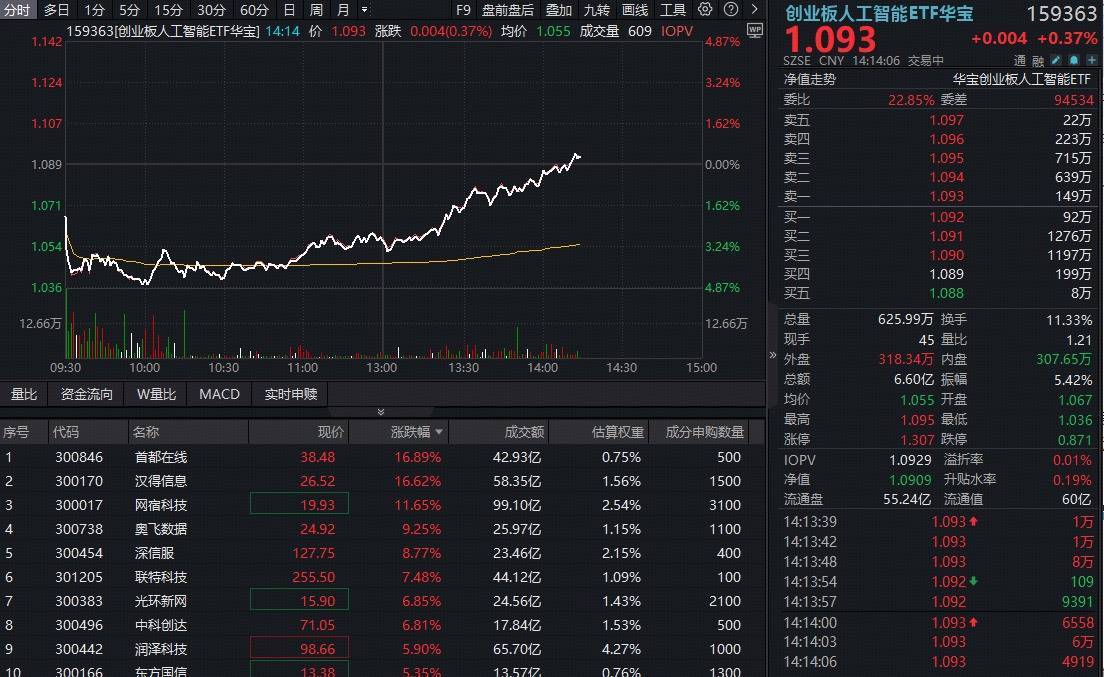 热门ETF方面,同类规模最大的华宝基金创业板人工智能ETF(159363)早盘一度下挫近5%,午后快速回暖翻红,场内上涨0.37%,60日均线失而复得,放量成交超6亿元!