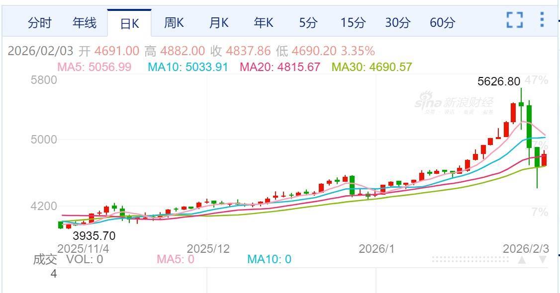 其中黄金在30日猛烈跳水,盘中最大跌幅超13%,2月2日再现跳水,一度大跌近10%,最低探至4423美元/盎司,今日开启反弹修复行情,盘中涨幅超过5%。